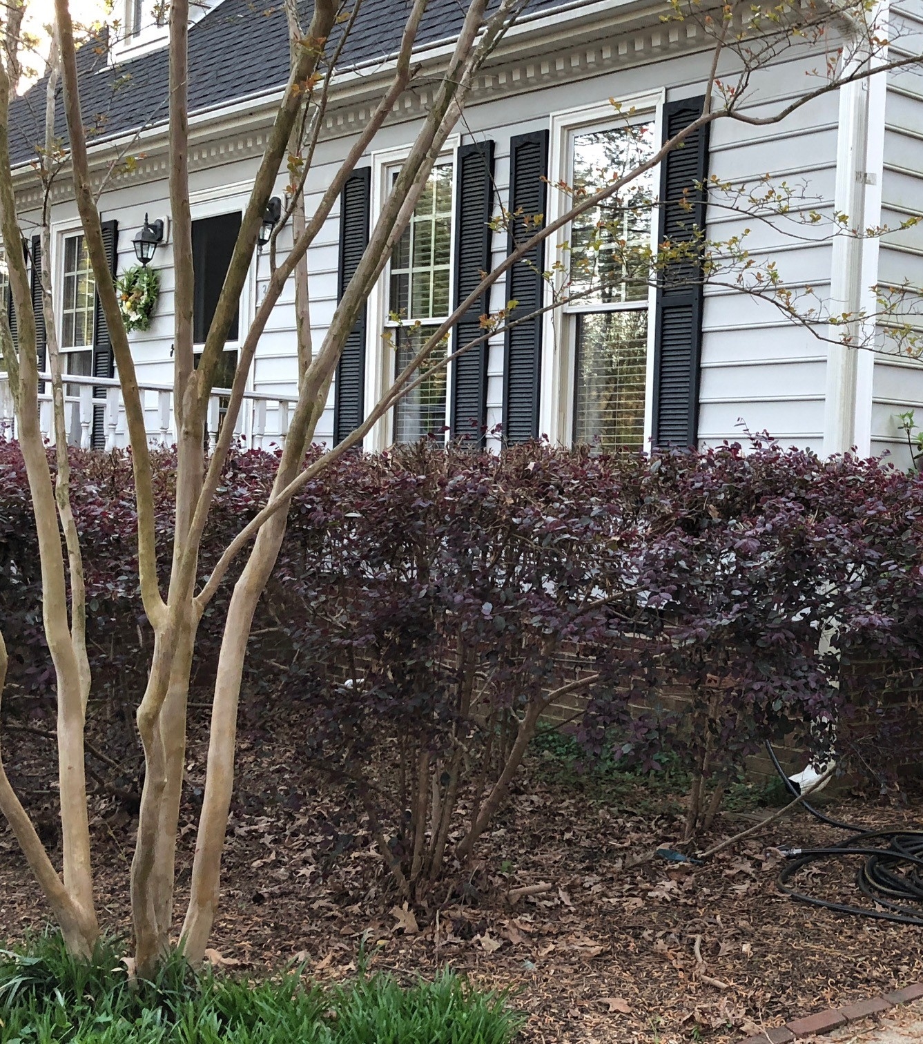 As promised, I left four lorapetalum skeletons flanking the front steps. I moved the other eight along the back of the property (which we promptly left unplanted for too long since the soil back there is more of a compacted cement sort of clay material mixed with nefarious Voldemort roots that run to the center of the earth). We eventually sort of got them into the ground. I spent the next month examining the branches, both in the front of the house and out by the property line for signs of growth, grabbing my husband outside to point out the tiny purple leaves slowly populating the wood. The four in front of the house survived, as did four that we transplanted. Four died. C’est la vie.
